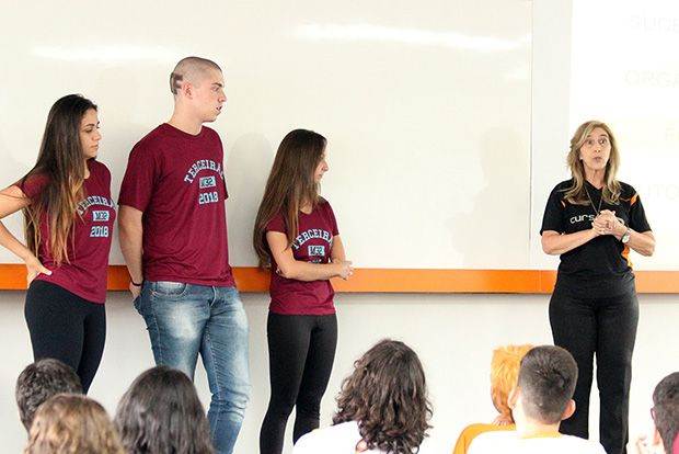 Um bate-papo com ex-alunos e com a coordenadora do Ensino Médio e do Pré-vestibular, Marcia Gil de Souza, marcou o primeiro dia de aula das turmas da 3ª série do Ensino Médio do Curso G9. O objetivo foi acolher os alunos que têm pela frente o desafio do Exame Nacional do Ensino Médio (ENEM) e dos demais vestibulares, como Fuvest, Unicamp e outros.