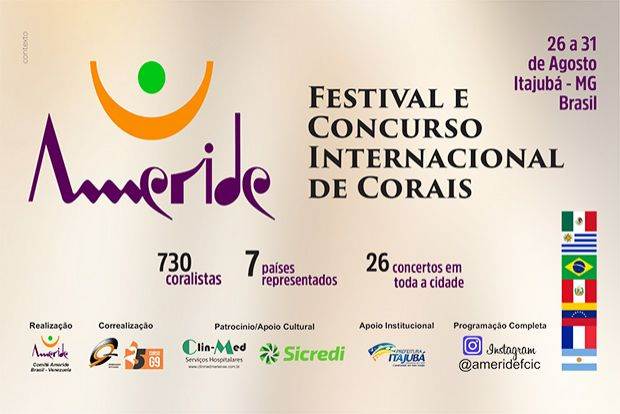 A oitava edição do Ameride – Festival Internacional de Corais irá reunir em torno de 730 coralistas, entre os dias 26 e 31 de agosto, em Itajubá: são 28 corais, de 7 países. As apresentações serão realizadas em escolas, igrejas, na concha acústica da Praça Theodomiro Santiago, Complexo Histórico e Cultural – AARO da Universidade Federal de Itajubá (Unifei) e no Teatro Municipal Christiane Riêra. Todas as apresentações são gratuitas.