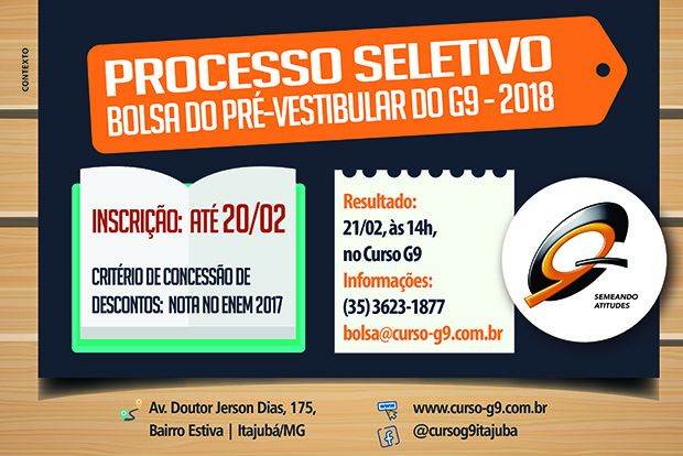 Termina em 20 de fevereiro o prazo para os alunos que pretendem participaram do processo seletivo de bolsas de estudo no Pré-vestibular do Curso G9. A seleção será feita com base nas notas obtidas pelo candidato no Exame Nacional do Ensino Médio (Enem) de 2017: quanto maiores as notas, maior o desconto.