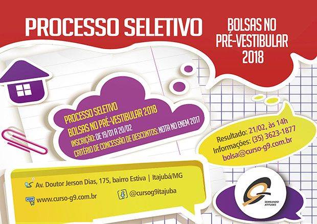 Curso G9 oferece bolsas de estudo para alunos que ingressarem no Pré-vestibular em 2018. As inscrições para o processo seletivo devem ser feitas entre 19 de janeiro e 20 de fevereiro pelo e-mail bolsa@curso-g9.com.br. Basta enviar a ficha de cadastro preenchida e uma cópia do relatório de notas do Exame Nacional do Ensino Médio (Enem) de 2017, obtido no site do Instituto Nacional de Estudos e Pesquisas (Inep).