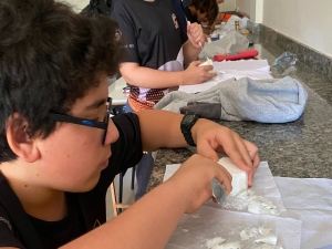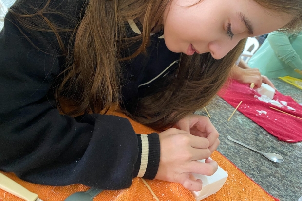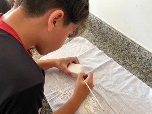 escultura, utilizando sabão de coco, palito e colher, com o tema figura humana.